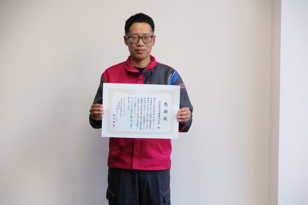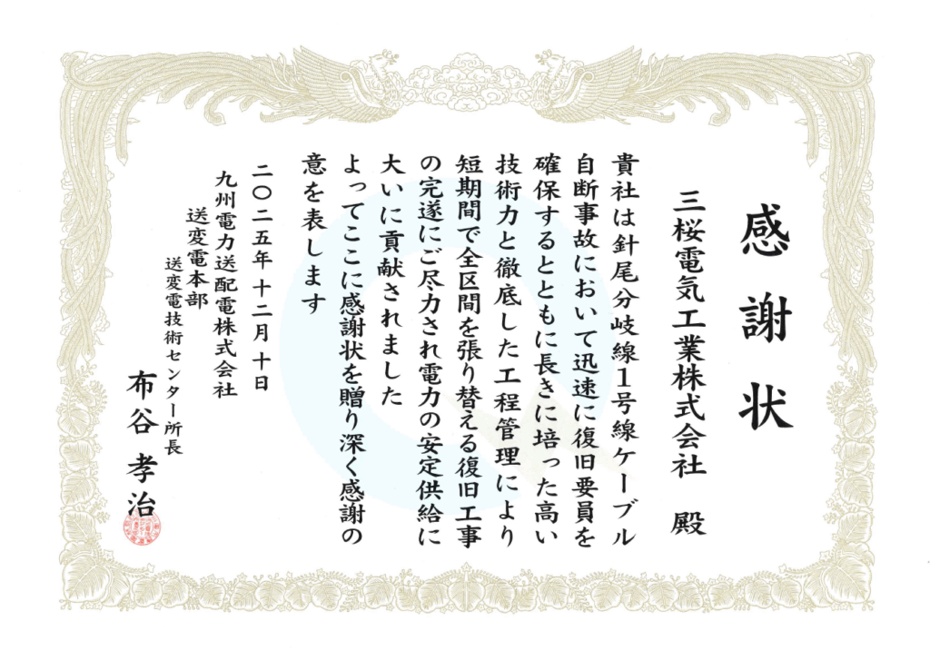 このたび、当社の地中送電部は、針尾分岐線1号線ケーブル自断事故において迅速に復旧要員を確保するとともに、短期間で全区間を張り替える復旧工事の完遂に貢献したことが高く評価され、感謝状をいただきました。
