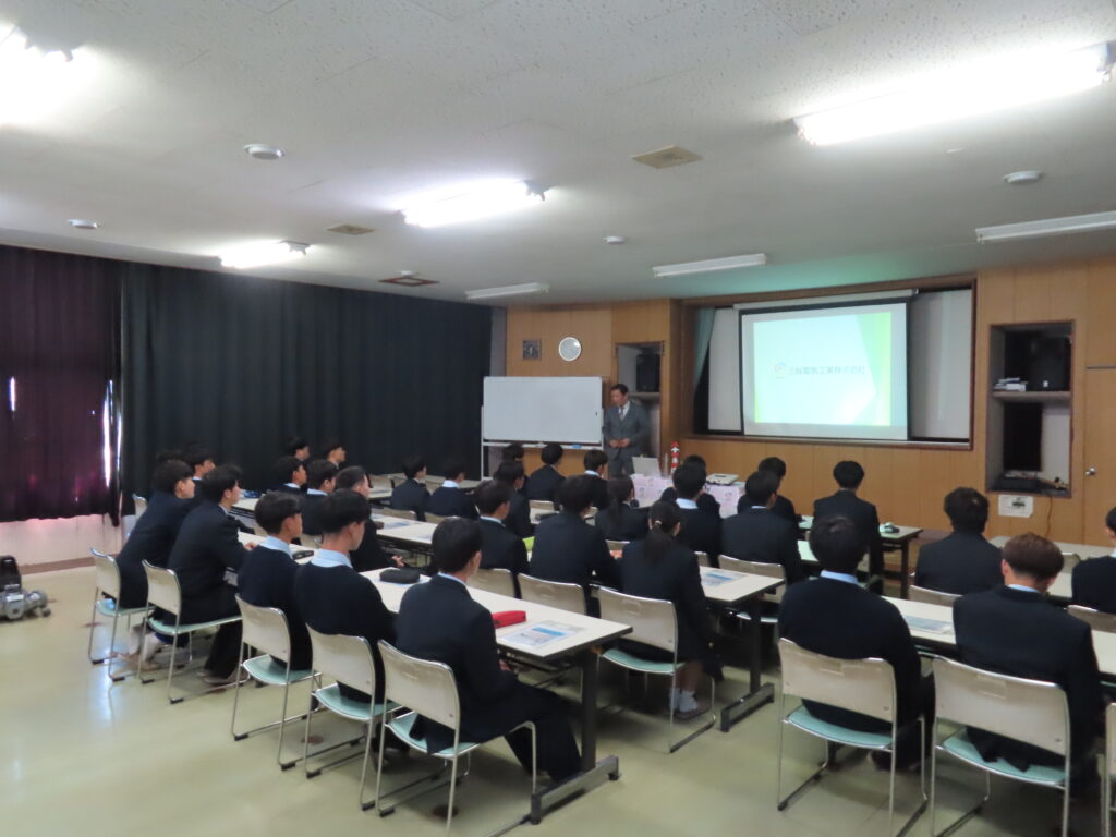 当日は2年生土木科36名の皆さまにご参加いただき、弊社を含めた送電工事会社の社会においての役割や、送電線工事に関する説明を主に行いました。