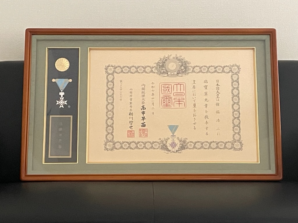この度、内閣府より令和7年秋の叙勲が発令され、弊社日向支店長 権堀浩二が電気施設保安業務における長年の功労により「瑞宝単光章」を受章いたしました。同章は公共性の高い業務に長年従事し、功績を積み重ねた者に授与される大変栄誉ある章です。
